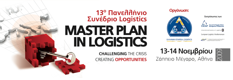 Η Ελληνική Εταιρία Logistics διοργανώνει το 13ο Πανελλήνιο Συνέδριο Logistics με τίτλο «Master Plan in Logistics» στις 13-14 Νοεμβρίου 2009 στο Ζάππειο Μέγαρο. Το συνέδριο τελεί υπό την αιγίδα των Υπουργείων Εμπορικής Ναυτιλίας Αιγαίου & Νησιωτικής Πολιτικής, Μεταφορών & Επικοινωνιών, καθώς και του Συνδέσμου Επιχειρήσεων & Βιομηχανιών.