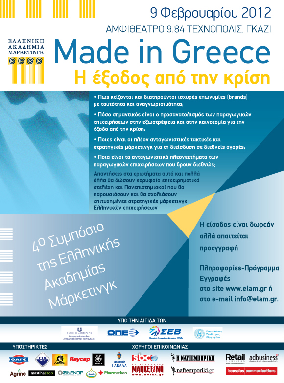 Η Ελληνική Ακαδημία Μάρκετινγκ (ΕΛ.Α.Μ.) διοργανώνει το 4ο Συμπόσιό της την Πέμπτη, 9 Φεβρουαρίου 2012 στη ΤΕΧΝΟΠΟΛΙΣ, Αμφιθέατρο Ραδιοφωνικού Σταθμού Αθήνα 984 «Γιάννης Ρίτσος», Πειραιώς 100, Γκάζι, με τίτλο “Made in Greece: Η έξοδος από την κρίση”.