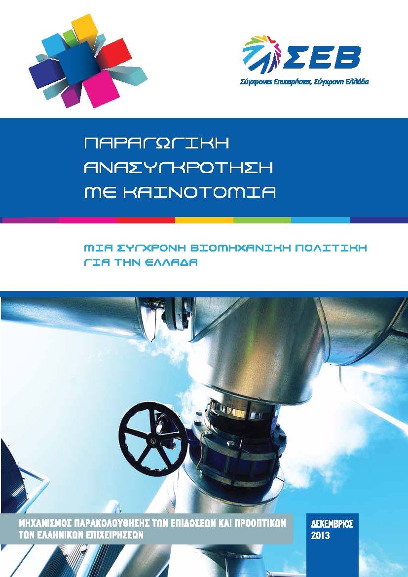 Ημερίδα με θέμα: “ΠΑΡΑΓΩΓΙΚΗ ΑΝΑΣΥΓΚΡΟΤΗΣΗ ΜΕ ΚΑΙΝΟΤΟΜΙΑ. Μία σύγχρονη βιομηχανική πολιτική για την Ελλάδα.” διοργάνωσε ο ΣΕΒ, την Τρίτη 17 Δεκεμβρίου 2013 και ώρα 13:00, στο ξενοδοχείο Hilton Athens. Στην ημερίδα παρουσιάστηκαν οι θέσεις του ΣΕΒ για τη νέα βιομηχανική πολιτική και την ανάπτυξη της επιχειρηματικότητας στη χώρα. Παρουσιάστηκαν τα αποτελέσματα Έρευνας σχετικά με τα ιδιαίτερα χαρακτηριστικά των ελληνικών επιχειρήσεων κατά την περίοδο της κρίσης και τις τεχνολογικές προοπτικές της ελληνικής οικονομίας. Η Hμερίδα διοργανώθηκε σε συνεργασία με το Ίδρυμα Οικονομικών & Βιομηχανικών Ερευνών (ΙΟΒΕ) και το ΕΜΠ – Εργαστήριο Βιομηχανικής και Ενεργειακής Οικονομίας.