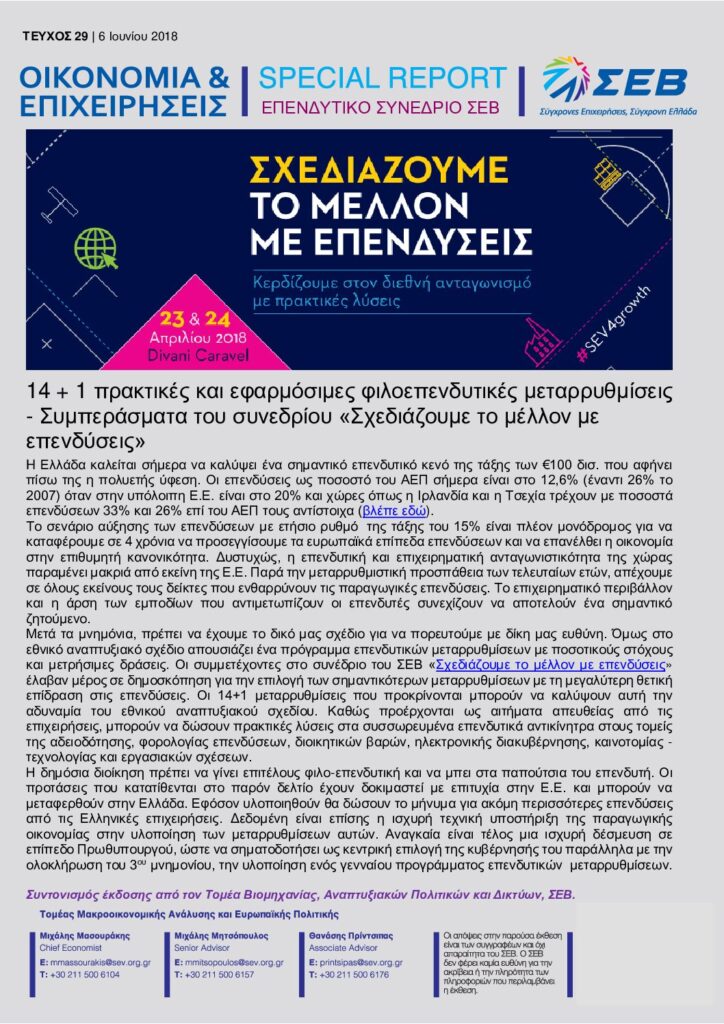 Μετά τα μνημόνια, πρέπει να έχουμε το δικό μας σχέδιο για να πορευτούμε με δίκη μας ευθύνη. Όμως στο εθνικό αναπτυξιακό σχέδιο απουσιάζει ένα πρόγραμμα επενδυτικών μεταρρυθμίσεων με ποσοτικούς στόχους και μετρήσιμες δράσεις. Οι συμμετέχοντες στο συνέδριο του ΣΕΒ «Σχεδιάζουμε το μέλλον με επενδύσεις» έλαβαν μέρος σε δημοσκόπηση για την επιλογή των σημαντικότερων μεταρρυθμίσεων με τη μεγαλύτερη θετική επίδραση στις επενδύσεις. Οι 14+1 μεταρρυθμίσεις που προκρίνονται μπορούν να καλύψουν αυτή την αδυναμία του εθνικού αναπτυξιακού σχεδίου. Καθώς προέρχονται ως αιτήματα απευθείας από τις επιχειρήσεις, μπορούν να δώσουν πρακτικές λύσεις στα συσσωρευμένα επενδυτικά αντικίνητρα στους τομείς της αδειοδότησης, φορολογίας επενδύσεων, διοικητικών βαρών, ηλεκτρονικής διακυβέρνησης, καινοτομίας – τεχνολογίας και εργασιακών σχέσεων.