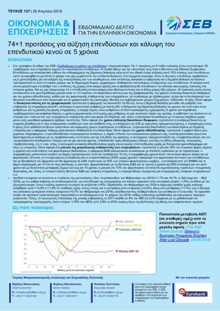 Διαβάστε εδώ το Εβδομαδιαίο Δελτίο για την Ελληνική οικονομία – Οικονομία & Επιχειρήσεις: 74+1 προτάσεις για αύξηση επενδύσεων και κάλυψη του επενδυτικού κενού σε 5 χρόνια – 26 Απριλίου 2018.