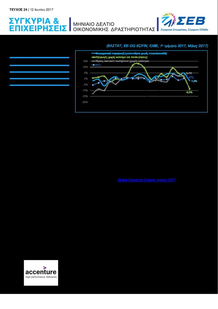 Οι προοπτικές της ελληνικής οικονομίας φαίνεται να ισχυροποιούνται, μετά την αναθεώρηση των στοιχείων του ΑΕΠ για το 1ο τρίμηνο του 2017, σύμφωνα με τα οποία προκύπτει ανάπτυξη +0,4% σε ετήσια βάση, έναντι ύφεσης -0,5% που είχε εκτιμηθεί αρχικά από την ΕΛΣΤΑΤ. Η διαφορά αυτή οφείλεται στην ενσωμάτωση στοιχείων που δεν ήταν διαθέσιμα κατά την πρώτη εκτίμηση, όπως στοιχεία από το ισοζύγιο πληρωμών του Μαρτίου, τους δείκτες κύκλου εργασιών στις υπηρεσίες και την έρευνα εργατικού δυναμικού. Πράγματι, η οικονομική δραστηριότητα κατά το 1ο τρίμηνο του 2017 παρουσίασε αξιόλογες επιδόσεις, με την παραγωγή, τις εξαγωγές και τις λιανικές πωλήσεις να κινούνται ανοδικά. Ωστόσο, η καθυστέρηση της ολοκλήρωσης της αξιολόγησης του προγράμματος προσαρμογής φαίνεται ότι επηρέασε αρνητικά το κλίμα τους επόμενους μήνες, με τις εξαγωγές και τη βιομηχανική παραγωγή να χάνουν μέρος της δυναμικής τους τον Απρίλιο και τις επιχειρηματικές προσδοκίες να εξασθενούν τον Μάιο, παρά τη μικρή βελτίωση της καταναλωτικής εμπιστοσύνης. Αυτό σημειώνεται, μεταξύ άλλων, και στην τελευταία έκθεση του ΟΟΣΑ (Global Economic Outlook, Ιούνιος 2017), ο οποίος, αν και αναπροσάρμοσε προς τα κάτω τις προβλέψεις για την ανάπτυξη της ελληνικής οικονομίας στο +1,1% το 2017 και στο +2,5% το 2018, εκτιμά ότι η ανάκαμψη σταδιακά εδραιώνεται, τονίζοντας την ανάγκη επίσπευσης των μεταρρυθμίσεων και ελάφρυνσης του δημόσιου χρέους.