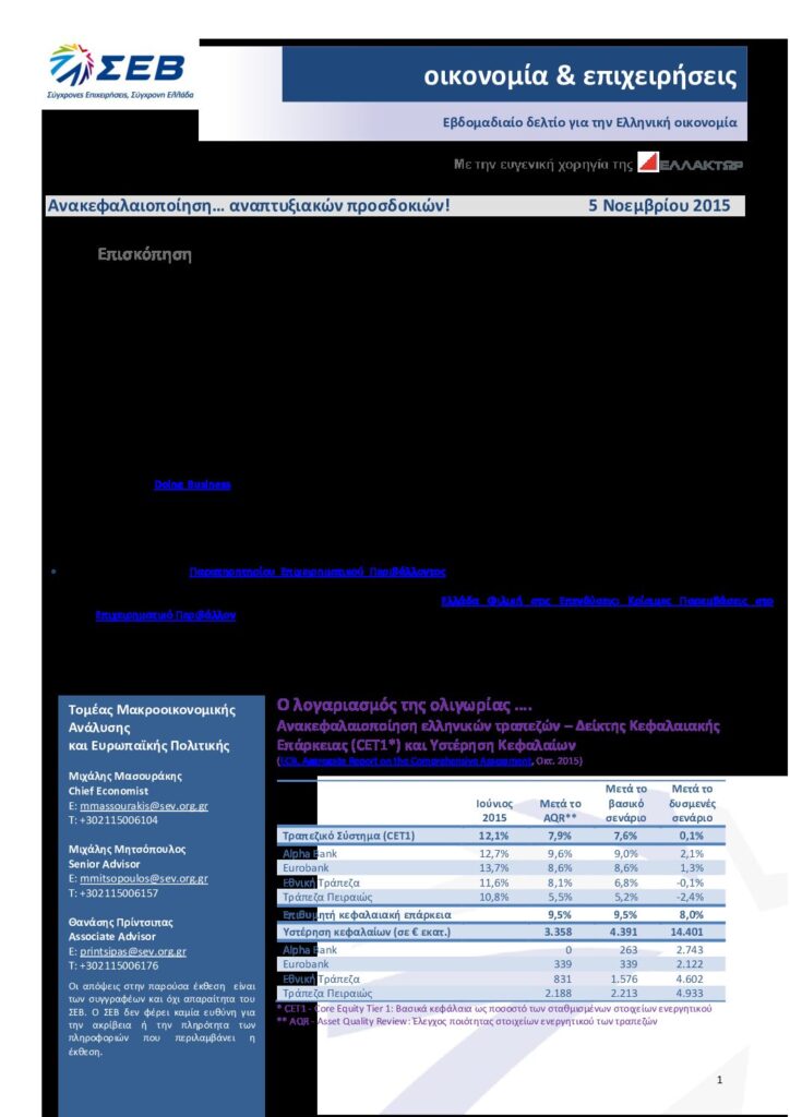 Διαβάστε εδώ το εβδομαδιαίο Δελτίο για την Ελληνική οικονομία – Οικονομία & Επιχειρήσεις: Ανακεφαλαιοποίηση… αναπτυξιακών προσδοκιών!- 5 Νοεμβρίου 2015.