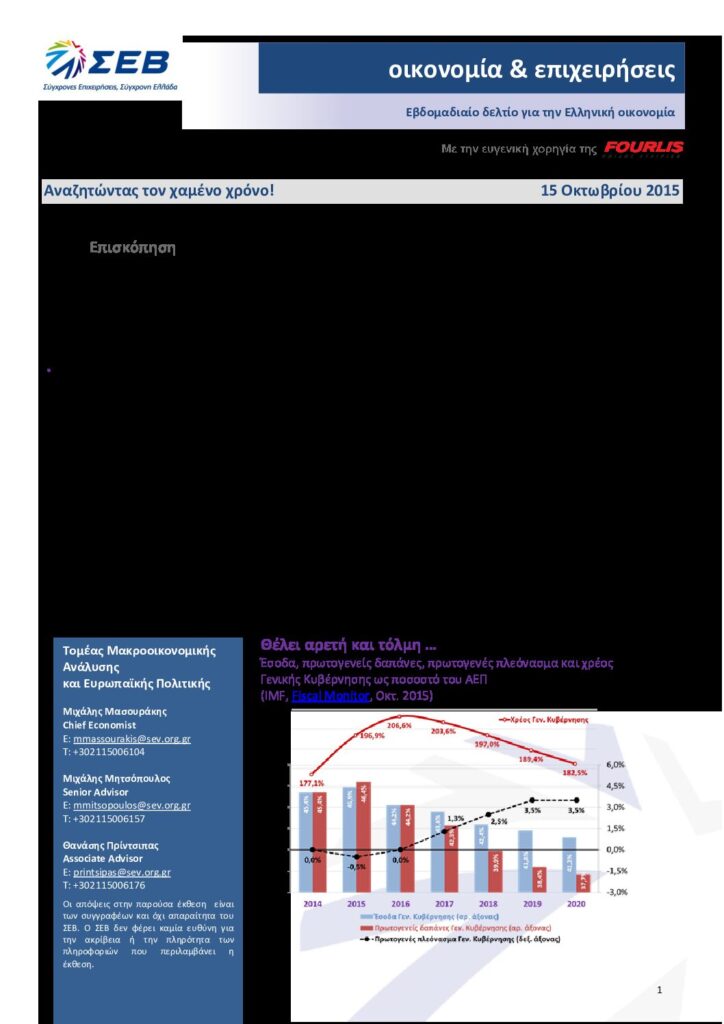 Διαβάστε εδώ το εβδομαδιαίο δελτίο για την Ελληνική οικονομία – Οικονομία & Επιχειρήσεις: Αναζητώντας τον χαμένο χρόνο! – 15 Οκτωβρίου 2015.