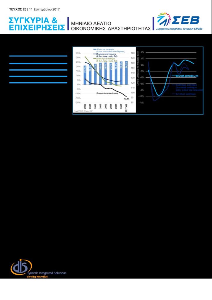 Τα στοιχεία αυτά αποτυπώνουν μια ανάκαμψη κατώτερη των προσδοκιών, γεγονός το οποίο μπορεί εν μέρει να αποδοθεί στην καθυστέρηση ολοκλήρωσης της 2ης αξιολόγησης του προγράμματος προσαρμογής. Η εικόνα των επενδύσεων εξακολουθεί να προβληματίζει, καθώς η συμβολή τους στη μεταβολή του ΑΕΠ κατά το 2ο τρίμηνο του 2017 ήταν αρνητική κατά -2,2 π.μ., ενώ συνολικά το 1ο εξάμηνο του 2017 οι επενδύσεις διαμορφώθηκαν σε €10,5 δισ. παρουσιάζοντας άνοδο μόλις +2,7% σε σύγκριση με το αντίστοιχο εξάμηνο του 2016, μετά από στασιμότητα στο επίπεδο των €21,1 δισ. το 2016 και το 2015. Παράλληλα, ο ρυθμός αύξησης της ιδιωτικής κατανάλωσης αποδυναμώθηκε κατά το 2ο τρίμηνο του 2017, με τη συμβολή της να περιορίζεται στις +0,5 π.μ. από +0,9 π.μ. το προηγούμενο τρίμηνο. Την ίδια ώρα, το ποσοστό αποταμίευσης των νοικοκυριών διαμορφώνεται σε ιστορικά χαμηλό αρνητικό επίπεδο (-9,4% το 2016 και -13,4% το 1ο τρίμηνο του 2017). Ταυτόχρονα, οι φόροι και οι εισφορές εξακολουθούν να διαβρώνουν το εισόδημα των νοικοκυριών, που ήδη συρρικνώνεται θέτοντας σε αμφιβολία τη βιωσιμότητα της ανάκαμψης της ελληνικής οικονομίας.