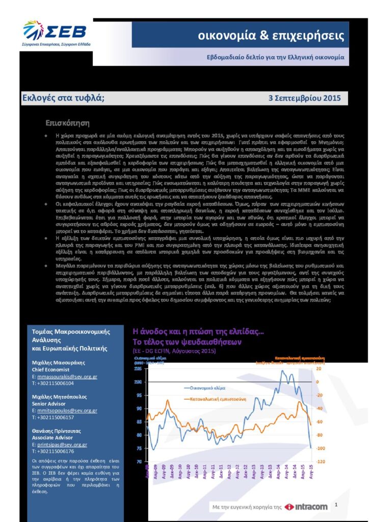 Διαβάστε εδώ το Εβδομαδιαίο δελτίο για την Ελληνική οικονομία – Οικονομία & Επιχειρήσεις: Εκλογές στα τυφλά; – 3 Σεπτεμβρίου 2015.