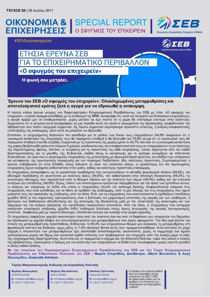 - Διαβάστε εδώ το Special Report: Έρευνα του ΣΕΒ «Ο σφυγμός του επιχειρείν»: Ολοκληρωμένες μεταρρυθμίσεις και αποτελεσματικό κράτος ζητά η αγορά για να εδραιωθεί η ανάκαμψη. – 5 Ιουλίου 2017.