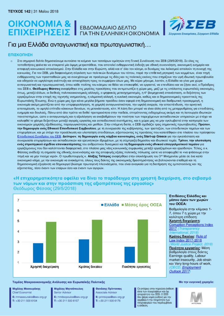 Διαβάστε εδώ το Εβδομαδιαίο Δελτίο για την Ελληνική οικονομία – Οικονομία & Επιχειρήσεις: Για μια Ελλάδα ανταγωνιστική και πρωταγωνιστική… – 31 Μαΐου 2018.