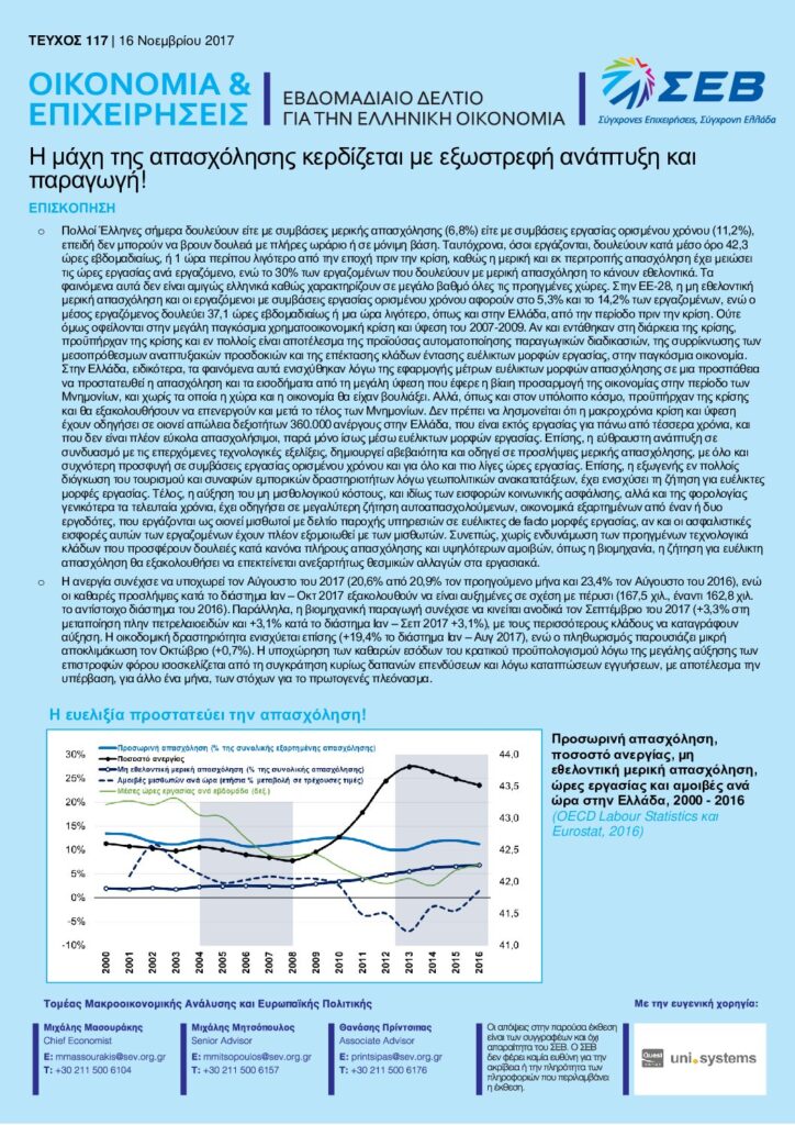 - Η ανεργία συνέχισε να υποχωρεί τον Αύγουστο του 2017 (20,6% από 20,9% τον προηγούμενο μήνα και 23,4% τον Αύγουστο του 2016), ενώ οι καθαρές προσλήψεις κατά το διάστημα Ιαν – Οκτ 2017 εξακολουθούν να είναι αυξημένες σε σχέση με πέρυσι (167,5 χιλ., έναντι 162,8 χιλ. το αντίστοιχο διάστημα του 2016). Παράλληλα, η βιομηχανική παραγωγή συνέχισε να κινείται ανοδικά τον Σεπτέμβριο του 2017 (+3,3% στη μεταποίηση πλην πετρελαιοειδών και +3,1% κατά το διάστημα Ιαν – Σεπ 2017 +3,1%), με τους περισσότερους κλάδους να καταγράφουν αύξηση. Η οικοδομική δραστηριότητα ενισχύεται επίσης (+19,4% το διάστημα Ιαν – Αυγ 2017), ενώ ο πληθωρισμός παρουσιάζει μικρή αποκλιμάκωση τον Οκτώβριο (+0,7%). Η υποχώρηση των καθαρών εσόδων του κρατικού προϋπολογισμού λόγω της μεγάλης αύξησης των επιστροφών φόρου ισοσκελίζεται από τη συγκράτηση κυρίως δαπανών επενδύσεων και λόγω καταπτώσεων εγγυήσεων, με αποτέλεσμα την υπέρβαση, για άλλο ένα μήνα, των στόχων για το πρωτογενές πλεόνασμα.