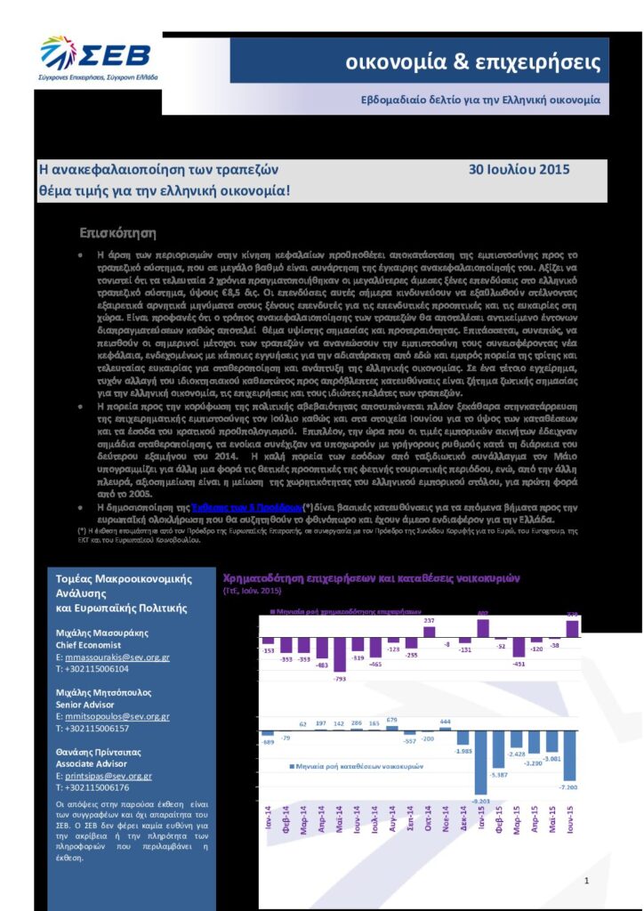 Διαβάστε εδώ το Εβδομαδιαίο δελτίο για την Ελληνική οικονομία – Οικονομία & Επιχειρήσεις: “Η ανακεφαλοποίηση των τραπεζών θέμα τιμής για την ελληνική οικονομία!” – 30 Ιουλίου 2015
