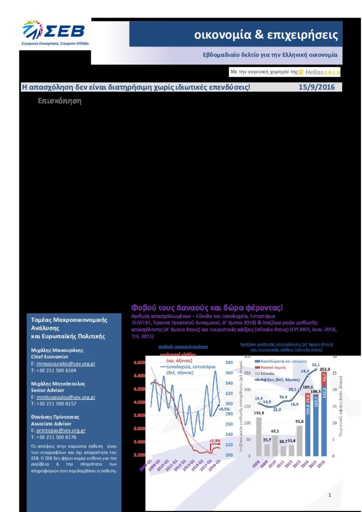 Διαβάστε εδώ το Eβδομαδιαίο Δελτίο για την Ελληνική οικονομία – Οικονομία & Επιχειρήσεις: Η απασχόληση δεν είναι διατηρήσιμη χωρίς ιδιωτικές επενδύσεις! – 15 Σεπτεμβρίου 2016.