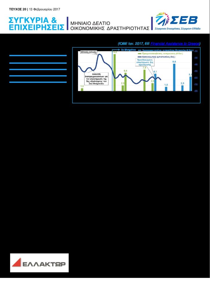Μετά τη σταδιακή βελτίωση του 2ου εξαμήνου του 2016, η οικονομία κινδυνεύει να εισέλθει εκ νέου σε μια τελματώδη κατάσταση, καθώς εντείνονται οι πιέσεις των δανειστών για πρόσθετα μέτρα, και λόγω της εν γένει διαφαινόμενης δυστοκίας της ελληνικής κυβέρνησης στην ολοκλήρωση της 2ης αξιολόγησης. Οι παρατεταμένες διαπραγματεύσεις αυξάνουν την αβεβαιότητα όπως καταγράφεται στην πτώση της καταναλωτικής εμπιστοσύνης τον Ιανουάριο του 2017. Έτσι, η αγορά δείχνει να τηρεί στάση αναμονής, ενώ διαμορφώνονται μικτές τάσεις σε διάφορους τομείς της οικονομίας.