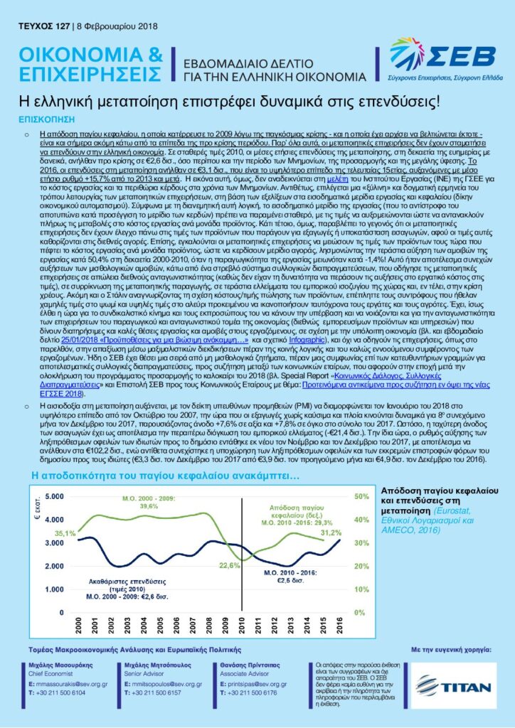 Διαβάστε εδώ το Εβδομαδιαίο Δελτίο για την Ελληνική οικονομία – Οικονομία & Επιχειρήσεις: Η ελληνική μεταποίηση επιστρέφει δυναμικά στις επενδύσεις! – 8 Φεβρουαρίου 2018.