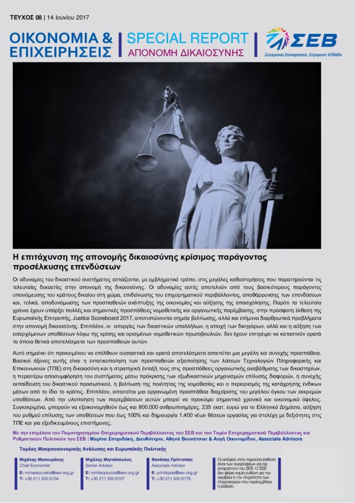 Αυτό σημαίνει ότι προκειμένου να επέλθουν ουσιαστικά και ορατά αποτελέσματα απαιτείται μια μεγάλη και συνεχής προσπάθεια. Βασικοί άξονες αυτής είναι η εντατικοποίηση των προσπαθειών αξιοποίησης των λύσεων Τεχνολογιών Πληροφορικής και Επικοινωνιών (ΤΠΕ) στη δικαιοσύνη και η στρατηγική ένταξή τους στις προσπάθειες οργανωτικής αναβάθμισης των δικαστηρίων, η περαιτέρω αποσυμφόρηση του συστήματος μέσω πρόκρισης των εξωδικαστικών μηχανισμών επίλυσης διαφορών, η συνεχής εκπαίδευση του δικαστικού προσωπικού, η βελτίωση της ποιότητας της νομοθεσίας και ο περιορισμός της κατάχρησης ένδικων μέσων από το ίδιο το κράτος. Επιπλέον, απαιτείται μια οργανωμένη προσπάθεια διαχείρισης του μεγάλου όγκου των εκκρεμών υποθέσεων. Από την υλοποίηση των παρεμβάσεων αυτών μπορεί να προκύψει σημαντικό χρονικό και οικονομικό όφελος. Συγκεκριμένα, μπορούν να εξοικονομηθούν έως και 800.000 ανθρωποημέρες. 235 εκατ. ευρώ για το Ελληνικό Δημόσιο, αύξηση του ρυθμού επίλυσης των υποθέσεων που έως 100% και δημιουργία 1.400 νέων θέσεων εργασίας για στελέχη με δεξιότητες στις ΤΠΕ και για εξειδικευμένους επιστήμονες.