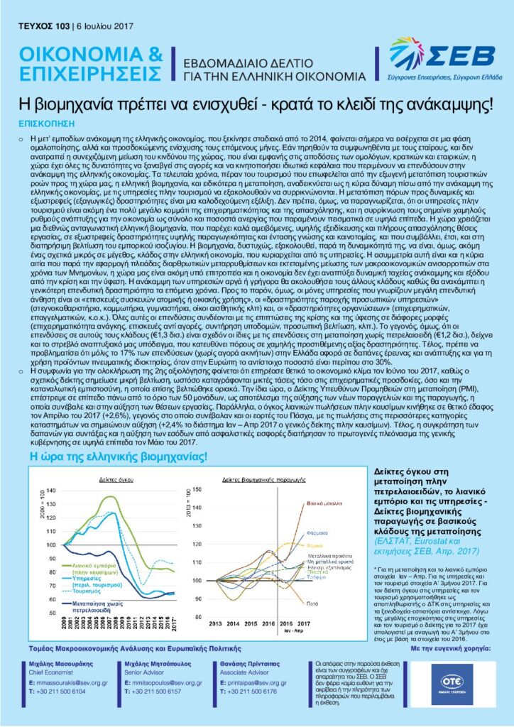 Διαβάστε εδώ το Εβδομαδιαίο Δελτίο για την Ελληνική οικονομία – Οικονομία & Επιχειρήσεις: Η βιομηχανία πρέπει να ενισχυθεί – κρατά το κλειδί της ανάκαμψης! – 6 Ιουλίου 2017.