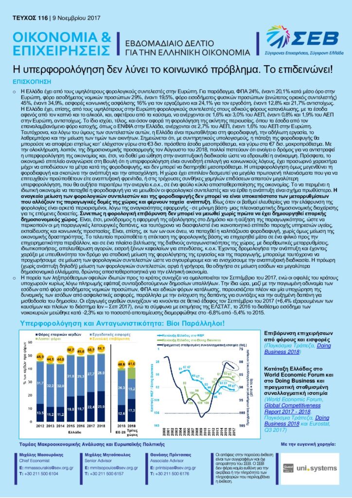 Διαβάστε εδώ το Εβδομαδιαίο Δελτίο για την Ελληνική οικονομία – Οικονομία & Επιχειρήσεις: Η υπερφορολόγηση δεν λύνει το κοινωνικό πρόβλημα. Το επιδεινώνει! – 9 Νοεμβρίου 2017.