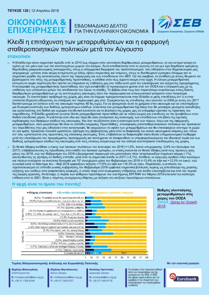 Διαβάστε εδώ το Εβδομαδιαίο Δελτίο για την Ελληνική οικονομία – Οικονομία & Επιχειρήσεις: Κλειδί η επιτάχυνση των μεταρρυθμίσεων και η εφαρμογή σταθεροποιητικών πολιτικών μετά τον Αύγουστο – 12 Απριλίου 2018.