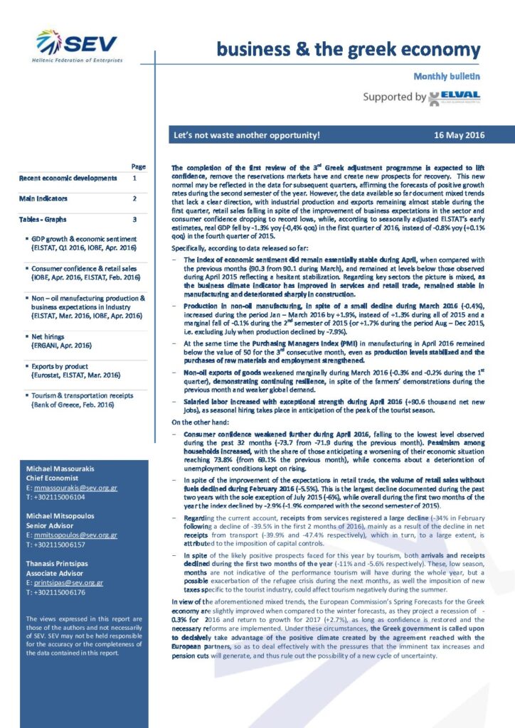 Με φόντο τις παραπάνω μικτές τάσεις, οι εαρινές προβλέψεις της Ευρωπαϊκής Επιτροπής για την ελληνική οικονομία είναι ελαφρά βελτιωμένες σε σχέση με τις χειμερινές, καθώς προβλέπει ύφεση -0,3% για το 2016 και επιστροφή σε θετικό ρυθμό ανάπτυξης το 2017 (+2,7%), εφόσον αποκατασταθεί η εμπιστοσύνη και πραγματοποιηθούν οι αναγκαίες μεταρρυθμίσεις. Στη βάση αυτή, η ελληνική κυβέρνηση καλείται να αξιοποιήσει χωρίς καθυστερήσεις την ευνοϊκή συγκυρία που διαμορφώνεται λόγω της συμφωνίας με τους εταίρους, αντιμετωπίζοντας αποτελεσματικά τις υφεσιακές πιέσεις που προκαλούν οι επικείμενες αυξήσεις φόρων και περικοπές των συντάξεων και απομακρύνοντας οριστικά το ενδεχόμενο έναρξης ενός νέου κύκλου αβεβαιότητας.