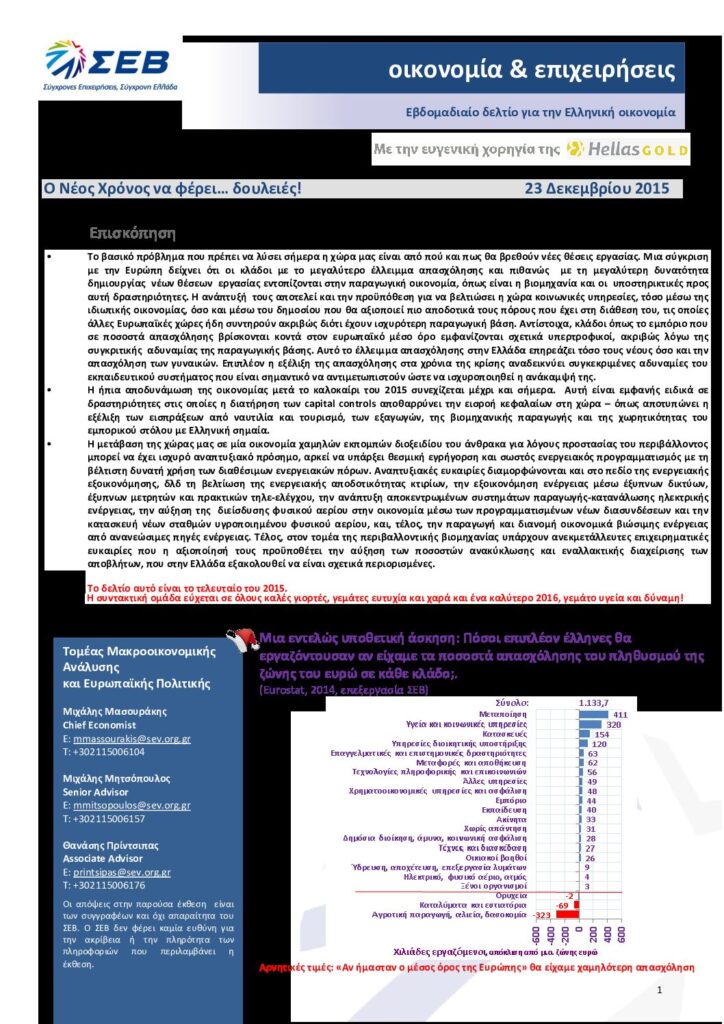 Διαβάστε εδώ Εβδομαδιαίο Δελτίο για την Ελληνική οικονομία – Οικονομία & Επιχειρήσεις: Ο Νέος Χρόνος να φέρει… δουλειές! – 23 Δεκεμβρίου 2015.