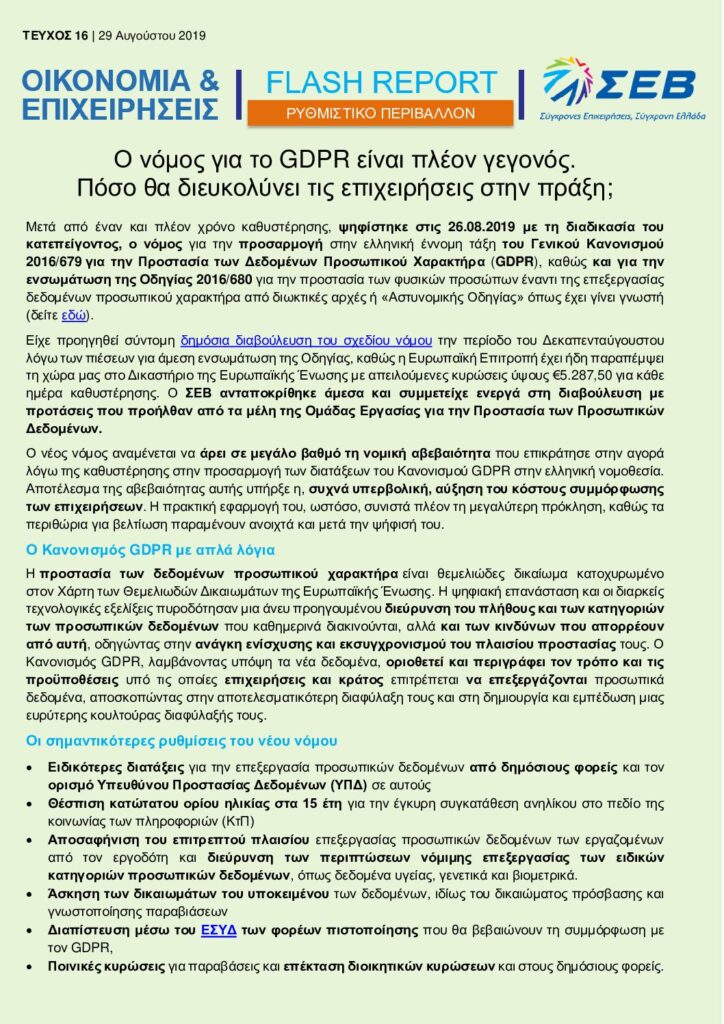 Διαβάστε εδώ το Flash Report “Ο νόμος για το GDPR είναι πλέον γεγονός. Πόσο θα διευκολύνει τις επιχειρήσεις στην πράξη;” – 29 Αυγούστου 2019
