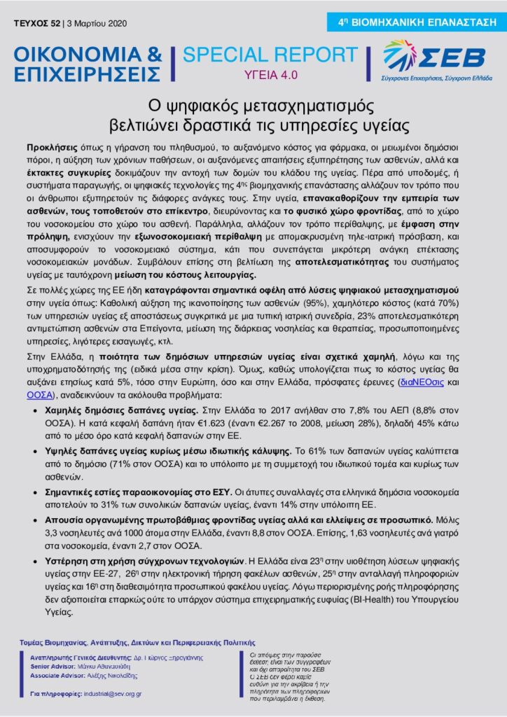 Προκλήσεις όπως η γήρανση του πληθυσμού, το αυξανόμενο κόστος για φάρμακα, οι μειωμένοι δημόσιοι πόροι, η αύξηση των χρόνιων παθήσεων, οι αυξανόμενες απαιτήσεις εξυπηρέτησης των ασθενών, αλλά και έκτακτες συγκυρίες δοκιμάζουν την αντοχή των δομών του κλάδου της υγείας. Πέρα από υποδομές, ή συστήματα παραγωγής, οι ψηφιακές τεχνολογίες της 4ης βιομηχανικής επανάστασης αλλάζουν τον τρόπο που οι άνθρωποι εξυπηρετούν τις διάφορες ανάγκες τους. Στην υγεία, επανακαθορίζουν την εμπειρία των ασθενών, τους τοποθετούν στο επίκεντρο, διευρύνοντας και το φυσικό χώρο φροντίδας, από το χώρο του νοσοκομείου στο χώρο του ασθενή. Παράλληλα, αλλάζουν τον τρόπο περίθαλψης, με έμφαση στην πρόληψη, ενισχύουν την εξωνοσοκομειακή περίθαλψη με απομακρυσμένη τηλε-ιατρική πρόσβαση, και αποσυμφορούν το νοσοκομειακό σύστημα, κάτι που συνεπάγεται μικρότερη ανάγκη επέκτασης νοσοκομειακών μονάδων. Συμβάλουν επίσης στη βελτίωση της αποτελεσματικότητας του συστήματος υγείας με ταυτόχρονη μείωση του κόστους λειτουργίας.