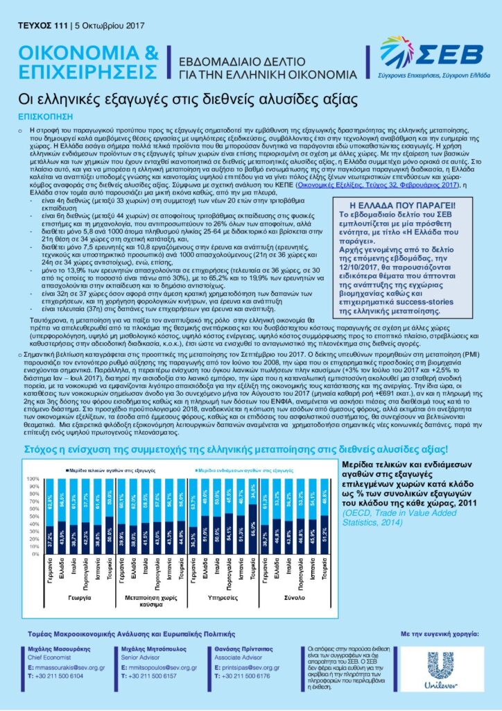 Διαβάστε εδώ το Εβδομαδιαίο Δελτίο για την Ελληνική οικονομία – Οικονομία & Επιχειρήσεις: Οι ελληνικές εξαγωγές στις διεθνείς αλυσίδες αξίας – 5 Οκτωβρίου 2017.