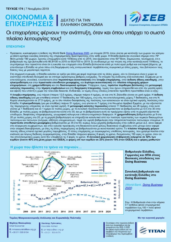 Πρόσφατα, κυκλοφόρησε η έκθεση της World Bank Doing Business 2020, με στοιχεία 2019, όπου γίνεται μια κατάταξη των χωρών του κόσμου με βάση κριτήρια ευκολίας άσκησης της επιχειρηματικής δραστηριότητας στην κάθε χώρα. Η Ελλάδα βρίσκεται συνολικά σήμερα στην 79η θέση μεταξύ 190 χωρών, έχοντας υποχωρήσει κατά 19 θέσεις από το 2015, όταν βρισκόταν στην 60η θέση. Σημειώνεται, ταυτόχρονα, ότι η βαθμολογία της έχει βελτιωθεί από 66,9/100 το 2015 σε 68,4/100 το 2019. Σε συνδυασμό με την πτώση της στην κατάταξη κατά 19 θέσεις, το συμπέρασμα που προκύπτει είναι ότι η ευκολία του επιχειρείν στην Ελλάδα βελτιώνεται αλλά με πολύ αργό ρυθμό και ανεπαρκή βήματα, με αποτέλεσμα η Ελλάδα να μένει πίσω στη διαμόρφωση ενός ανταγωνιστικού περιβάλλοντος συγκριτικά με άλλες χώρες, που βελτιώνουν τους δείκτες τους με μεγαλύτερη ταχύτητα.