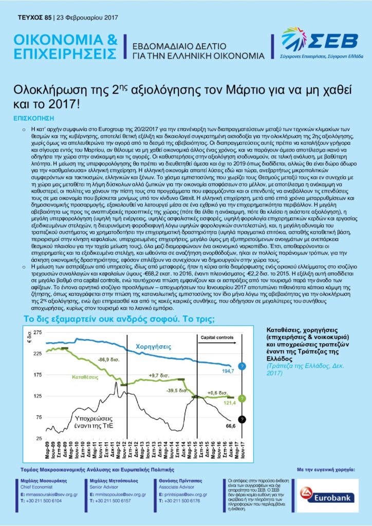 Διαβάστε εδώ το Εβδομαδιαίο Δελτίο για την Ελληνική οικονομία – Οικονομία & Επιχειρήσεις: Ολοκλήρωση της 2ης αξιολόγησης τον Μάρτιο για να μη χαθεί και το 2017! – 23 Φεβρουαρίου 2017.