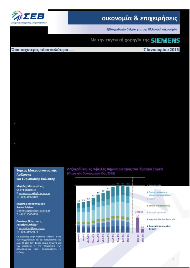 Η εφαρμογή του προγράμματος προσαρμογής απαιτεί άμεσα διορθωτικές κινήσεις ώστε να επισπευσθεί η επίτευξη των στόχων του. Η υλοποίηση του 3ου Μνημονίου το 2015 προέβλεπε, πέραν της επίτευξης των δημοσιονομικών στόχων, την πληρωμή ληξιπρόθεσμων οφειλών του δημοσίου προς τον ιδιωτικό τομέα, ύψους €3,1 δισ., τη δημιουργία ταμειακού αποθέματος, ύψους €3,2 δισ. και ιδιωτικοποιήσεις ύψους €1,2 δισ. Λόγω καθυστερήσεων κανένας από τους στόχους αυτούς δεν επετεύχθη, δεν έκλεισε η 1η αξιολόγηση και, συνεπώς, δεν έχουν δοθεί στη χώρα οι δόσεις Νοεμβρίου και Δεκεμβρίου 2015, ύψους €3,7 δισ. και €2 δισ. αντιστοίχως που θα καθιστούσαν δυνατές τις πληρωμές ληξιπροθέσμων και την δημιουργία ταμειακού αποθέματος ως ανωτέρω. Οι καθυστερήσεις του 2015 θα πρέπει να καλυφθούν το 2016, για να παραμείνει το πρόγραμμα σε πορεία επιτυχούς υλοποίησης και να επιφέρει τα επιθυμητά αποτελέσματα. Η υλοποίηση του προγράμματος προσαρμογής το 2016 προβάλλει, συνεπώς, ως αναγκαιότητα υψίστης σημασίας για την επαναφορά της χώρας στην κανονικότητα των αγορών και της ανάπτυξης. Η εφαρμογή του προϋπολογισμού προϋποθέτει €1,8 δισ. σε παρεμβάσεις στην κοινωνική ασφάλιση και €3,2 δισ. σε έσοδα από νέους φόρους. Η υλοποίηση του χρηματοδοτικού σχεδίου του 3ου Μνημονίου για το 2016, πέραν της εξυπηρέτησης του χρέους που απαιτεί επιπλέον €12,8 δισ. περίπου, περιλαμβάνει επίσης έσοδα από ιδιωτικοποιήσεις €4,8 δισ., πληρωμή των ληξιπρόθεσμων οφειλών του δημοσίου προς τον ιδιωτικό τομέα, ύψους €6,5 δισ. περίπου και τη δημιουργία ταμειακού αποθέματος €5,5 δισ. περίπου, αντισταθμιζόμενων έτσι των καθυστερήσεων που σημειώθηκαν το 2015. Υπάρχουν οι προϋποθέσεις το πρόγραμμα να εφαρμοσθεί ως έχει σχεδιασθεί. Οι πόροι της χρηματοδοτικής βοήθειας θα πρέπει, πέραν της εξυπηρέτησης του χρέους, να βοηθήσουν επιτέλους την ανάκαμψη της εγχώριας οικονομίας μέσω των ιδιωτικοποιήσεων και της αύξησης της ρευστότητας με την εξόφληση των χρεών του κράτους προς τις ιδιωτικές επιχειρήσεις, που έχουν επιβαρυνθεί από τη φοροεπιδρομή του 2016 και τους περιορισμούς στην κίνηση κεφαλαίων. Τέλος, χωρίς τη δημιουργία ενός ταμειακού αποθέματος σεβαστού ύψους, το δημόσιο δεν θα διαθέτει την αξιοπιστία που απαιτείται ώστε να προσφύγει κάποια στιγμή στις αγορές. Συνεπώς, οι καθυστερήσεις θα πρέπει να εξαλειφθούν και το πρόγραμμα να υλοποιηθεί, ως έχει σχεδιασθεί, για να μπορέσει η χώρα να μπει επιτέλους σε έναν ενάρετο κύκλο αυτοδυναμίας και αυτοπεποίθησης, για να αποκατασταθεί η εμπιστοσύνη στις δυνάμεις της χώρας και των ανθρώπων της.