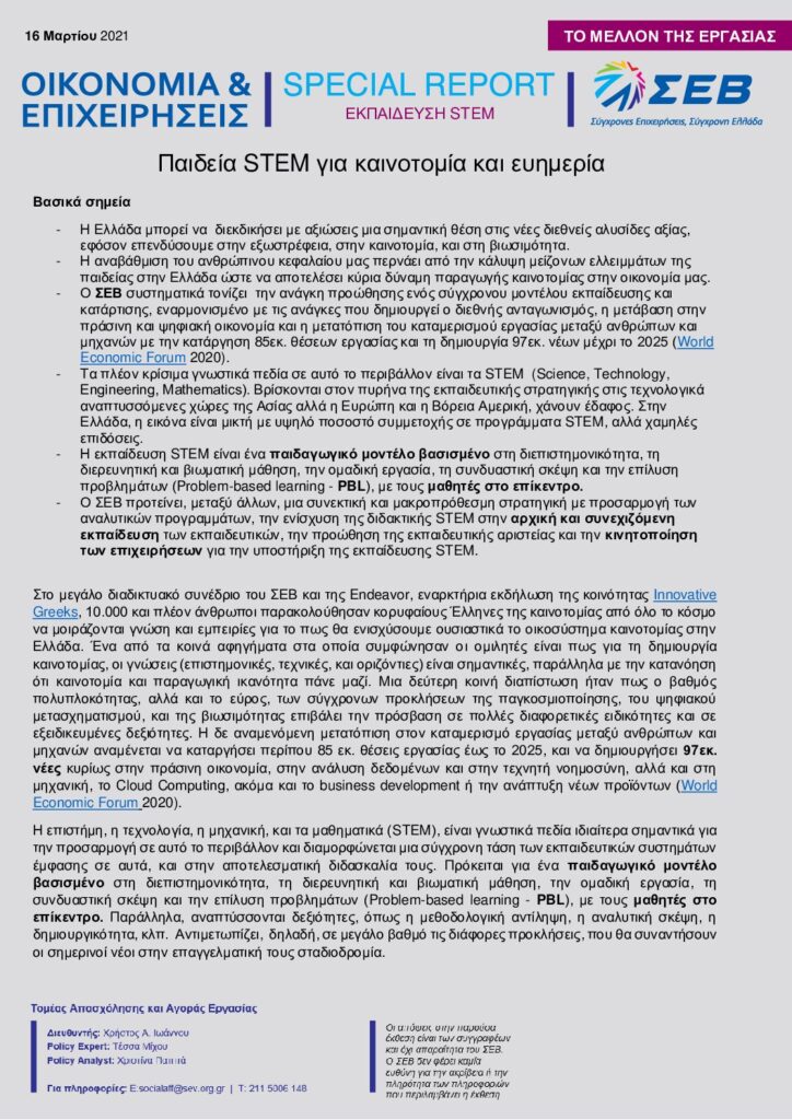 • Ο ΣΕΒ προτείνει, μεταξύ άλλων, μια συνεκτική και μακροπρόθεσμη στρατηγική με προσαρμογή των αναλυτικών προγραμμάτων, την ενίσχυση της διδακτικής STEM στην αρχική και συνεχιζόμενη εκπαίδευση των εκπαιδευτικών, την προώθηση της εκπαιδευτικής αριστείας και την κινητοποίηση των επιχειρήσεων για την υποστήριξη της εκπαίδευσης STEM.