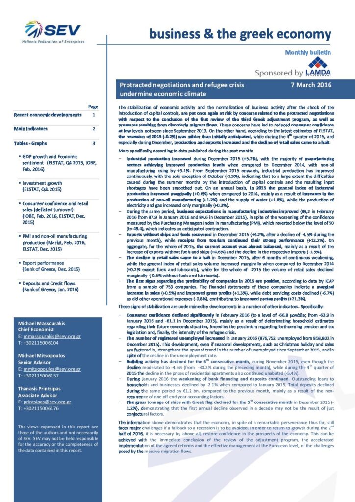 Διαβάστε εδώ το Μηνιαίο δελτίο οικονομικής δραστηριότητας: Προσφυγικό και παρατεινόμενη διαπραγμάτευση υπονομεύουν το οικονομικό κλίμα – 7 Μαρτίου 2016.