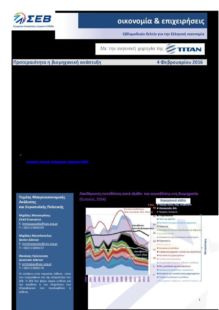 Διαβάστε εδώ το Εβδομαδιαίο Δελτίο για την Ελληνική οικονομία – Οικονομία & Επιχειρήσεις: Προτεραιότητα η βιομηχανική ανάπτυξη – 4 Φεβρουαρίου 2016.
