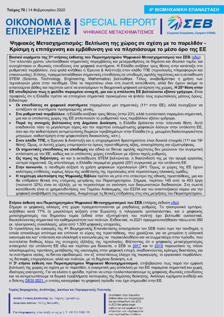 Βασικά ευρήματα της 3ης ετήσιας έκθεσης του Παρατηρητηρίου Ψηφιακού Μετασχηματισμού του ΣΕΒ (εδώ)