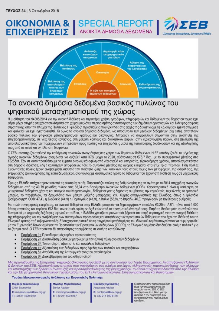 Με πολύ συντηρητικές εκτιμήσεις, τα ανοικτά δεδομένα στην Ελλάδα μπορούν να δημιουργήσουν επιπλέον €3,2δισ. ΑΕΠ, πάνω από 1.000 θέσεις εργασίας και περίπου €12 δισ. σωρευτικά οφέλη εντός 5 ετών από το πραγματικό άνοιγμά τους. Παρά τη διαθεσιμότητα ανθρώπινου δυναμικού με ψηφιακές δεξιότητες υψηλού επιπέδου, η Ελλάδα χρειάζεται ρεαλιστικά βήματα και σαφή στρατηγική για την ανοιχτή διάθεση της πληροφορίας και την αναβάθμιση των συστημάτων προστασίας και ασφάλειας των προσωπικών δεδομένων που έχει στη διάθεσή του το Ελληνικό κράτος από κυβερνοαπειλές. Είναι χαρακτηριστικό ότι τη στιγμή που μεγάλο μέρος του ιδιωτικού τομέα υποχρώνεται να συμμορφωθεί με τον Ευρωπαϊκό Κανονισμό για την Προστασία των Προσωπικών Δεδομένων (GDPR), το Ελληνικό Δημόσιο δεν διαθέτει ακόμη πολιτική για το ζήτημα αυτό. Ο ΣΕΒ προτείνει έξι απαραίτητες παρεμβάσεις σε αυτή τη κατεύθυνση: