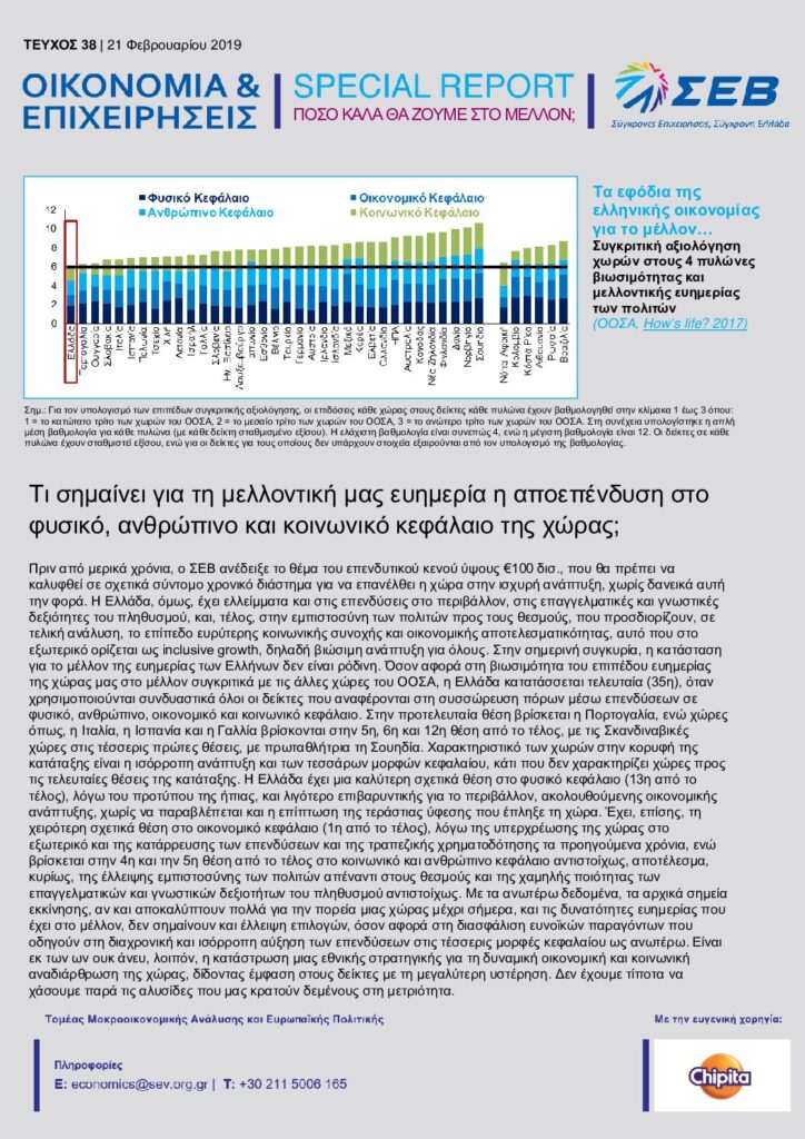 Στην σημερινή συγκυρία, η κατάσταση για το μέλλον της ευημερίας των Ελλήνων δεν είναι ρόδινη. Όσον αφορά στη βιωσιμότητα του επιπέδου ευημερίας της χώρας μας στο μέλλον συγκριτικά με τις άλλες χώρες του ΟΟΣΑ, η Ελλάδα κατατάσσεται τελευταία (35η), όταν χρησιμοποιούνται συνδυαστικά όλοι οι δείκτες που αναφέρονται στη συσσώρευση πόρων μέσω επενδύσεων σε φυσικό, ανθρώπινο, οικονομικό και κοινωνικό κεφάλαιο. Στην προτελευταία θέση βρίσκεται η Πορτογαλία, ενώ χώρες όπως, η Ιταλία, η Ισπανία και η Γαλλία βρίσκονται στην 5η, 6η και 12η θέση από το τέλος, με τις Σκανδιναβικές χώρες στις τέσσερις πρώτες θέσεις, με πρωταθλήτρια τη Σουηδία. Χαρακτηριστικό των χωρών στην κορυφή της κατάταξης είναι η ισόρροπη ανάπτυξη και των τεσσάρων μορφών κεφαλαίου, κάτι που δεν χαρακτηρίζει χώρες προς τις τελευταίες θέσεις της κατάταξης.