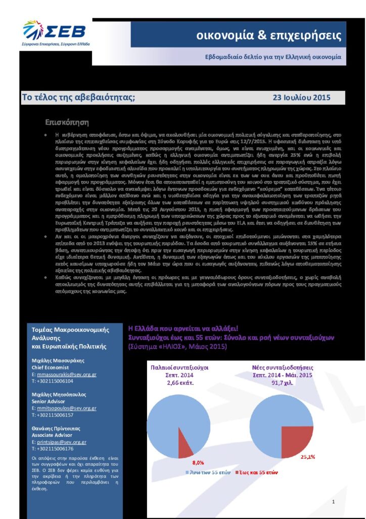 Διαβάστε εδώ το Εβδομαδιαίο δελτίο για την Ελληνική οικονομία – Οικονομία & Επιχειρήσεις: “Το τέλος της αβεβαιότητας;” – 23 Ιουλίου 2015.