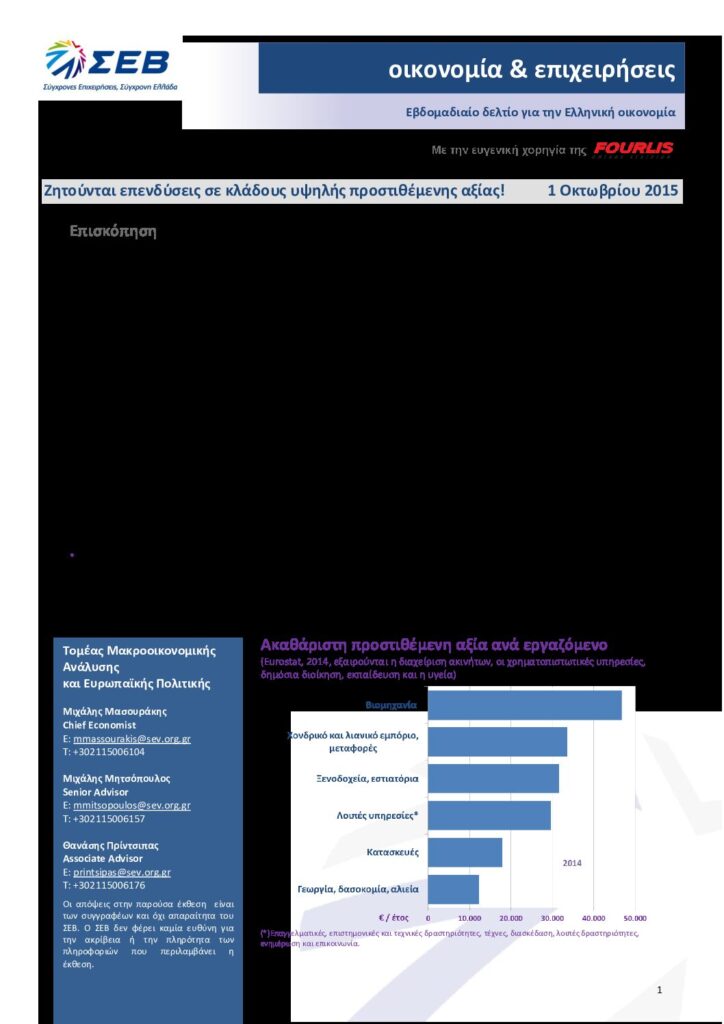 Διαβάστε εδώ το Εβδομαδιαίο δελτίο για την Ελληνική οικονομία – Οικονομία & Επιχειρήσεις: Ζητούνται επενδύσεις σε κλάδους υψηλής προστιθέμενης αξίας! – 1 Οκτωβρίου 2015.